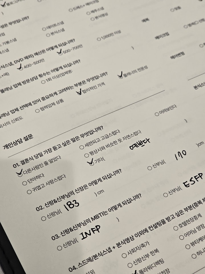 설문지를 체크하다보면 플래너님께서 오셔서 하나부터 열까지 하나하나 상세하게 설명해주시는데